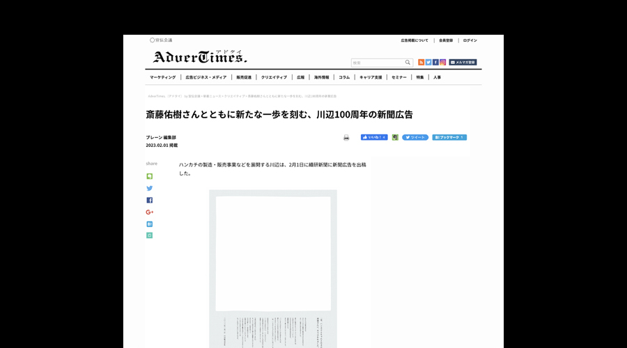 KAWABE × Yuki Saito「川辺100周年新聞広告」が